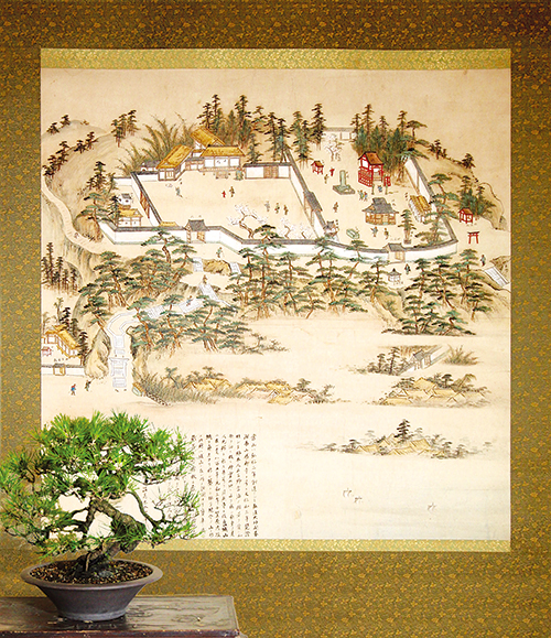 この図は明治17年(1884)に横山東黄によって描かれた図です。書付によると宝庫にあり260年たち、虫喰いもひどくなっていた図を写したもので、絵図を詳細に見ると現在人丸山の麓にある亀の水の亀形樋水口が描かれていません。この口は享保4年(1719)に出来たといわれており、これ以前に描かれたものと思われます。また現在柿本神社にある柿本人麻呂祠堂碑(亀の碑)が描かれています。この碑は寛文4年(1664)明石城主松平信之によってつくられたものでそれ以降のものです。よって今から約300年から350年前の月照寺の様子をあらわした図と推定できます。