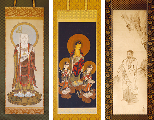 ここに一部の軸をご紹介しますが、月照寺の寺宝として永く伝わってきたものです。これら寺宝類も経年劣化がいちじるしいものが多数あり、その中から優先選択し、十三年余りにわたり、五十数点を修復させていただきました。この作業は寺宝部会が中心となって進めています。これからも古文書等重要な寺宝類を順次補修していく予定です。檀信徒の皆様には変わりないご理解とご支援をお願い申し上げます。