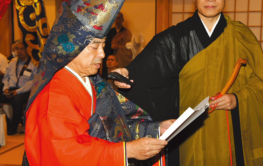 圧巻だったのは、本堂中央の須弥壇(しゅみだん)(ご本尊が安置されている場所)に、参加者数名ずつ登壇し、安名(戒名)のほか”血脈“と呼ばれる証書を教授師さまから受け取る儀式(正授道場)でした。須弥壇に登壇するという普段では考えられない行為を体験したのは貴重でした。